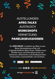 Die AFRO.MESSE in Frankfurt am Main ist eine Messe Veranstaltung auf der sich zivilgesellschaftliche Akteur:innen, Politiker:innen, Künstler:innen und Unternehmer:innen aus Schwarzen, afrikanischen und afrodiasporischen Communities zusammenfinden und vernetzen.